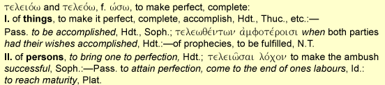 Jesus said, “It is perfect,” and bowed his head and died. That is, it is complete, finished. The task that God had assigned him had been completed. Perfect here means “complete” and “finished.” | |
