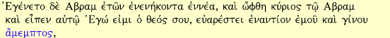 I find this interesting. In the Hebrew, both words are tamiym but the Septuagint translates Genesis 17:1 as “blameless” (“ a” = without and “ memptos” = blame) and it translates Deuteronomy 18:13 as our old friend “perfect” (  ).